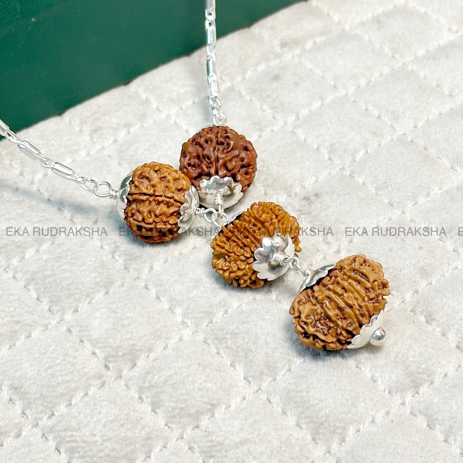 The Kaarya Sampanna Rudraksha Mala is a unique and sacred necklace crafted with an auspicious blend of 4 Mukhi, 7 Mukhi, 13 Mukhi, and 14 Mukhi Rudraksha beads, beautifully set in a silver mala. Each bead in this combination holds distinct spiritual and cosmic significance, empowering the wearer with a holistic balance of wisdom, growth, courage, and divine blessings.