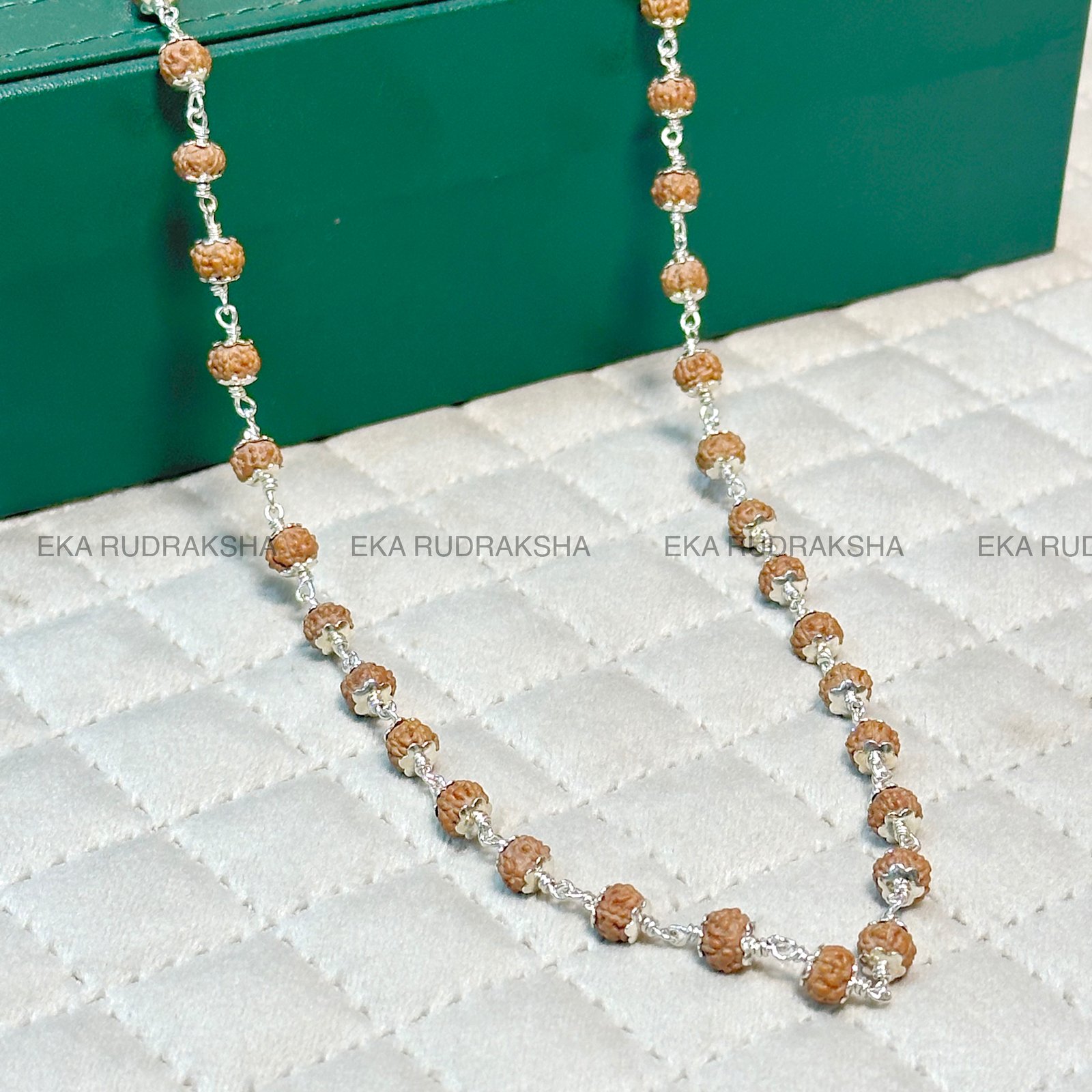 Beautifully crafted authentic rudraksha mala done in pure silver chain form.