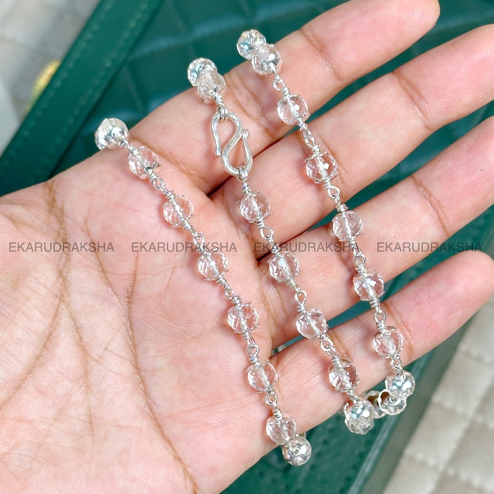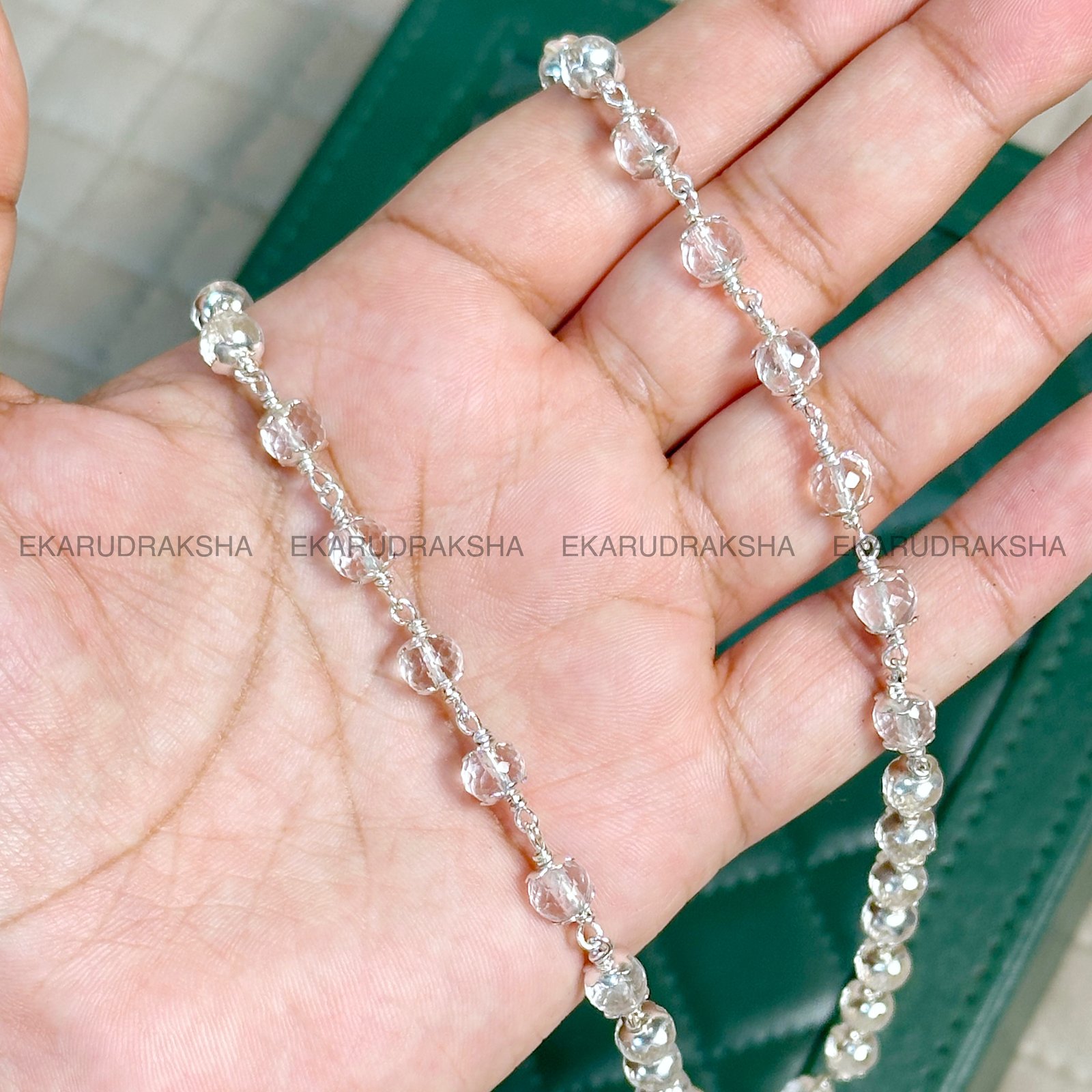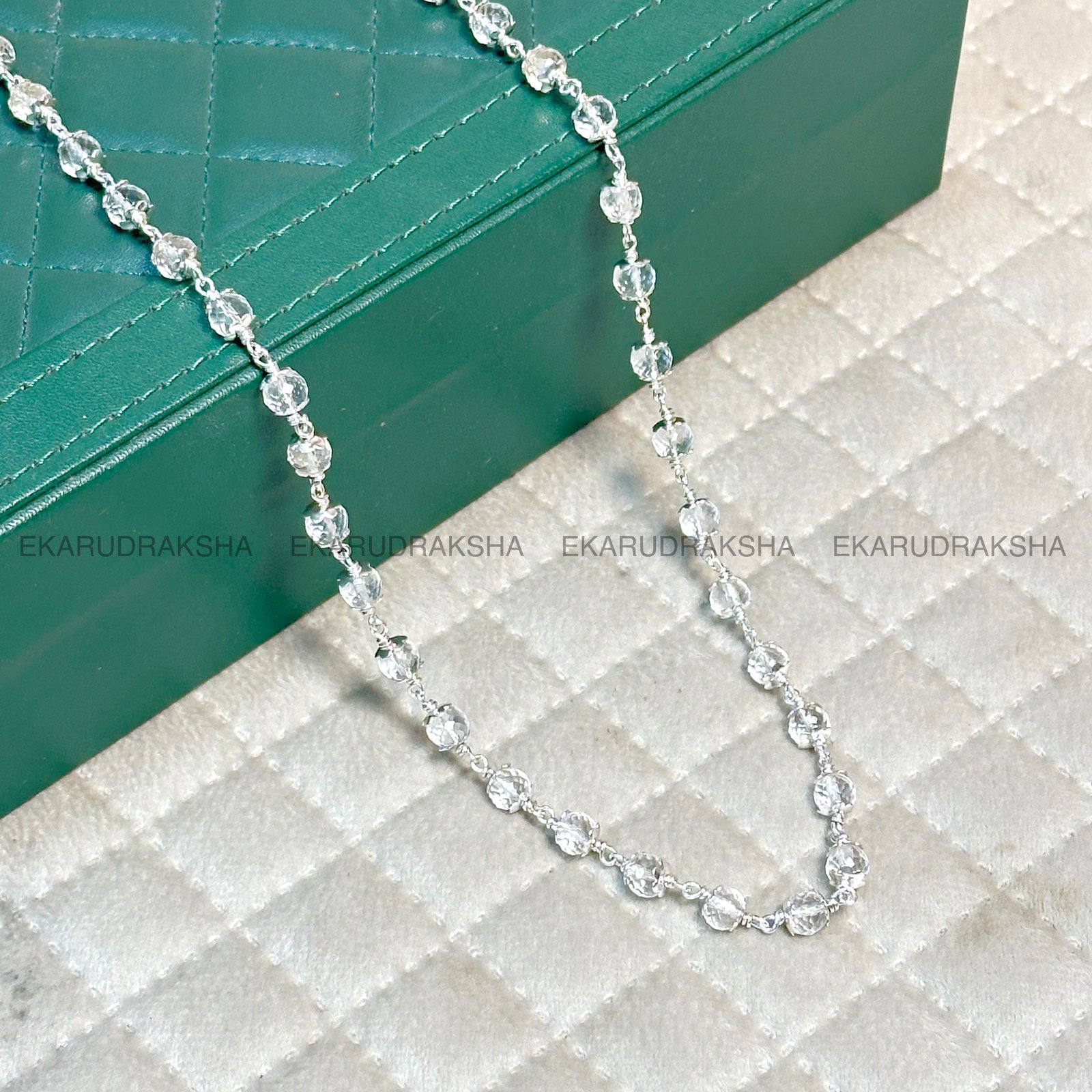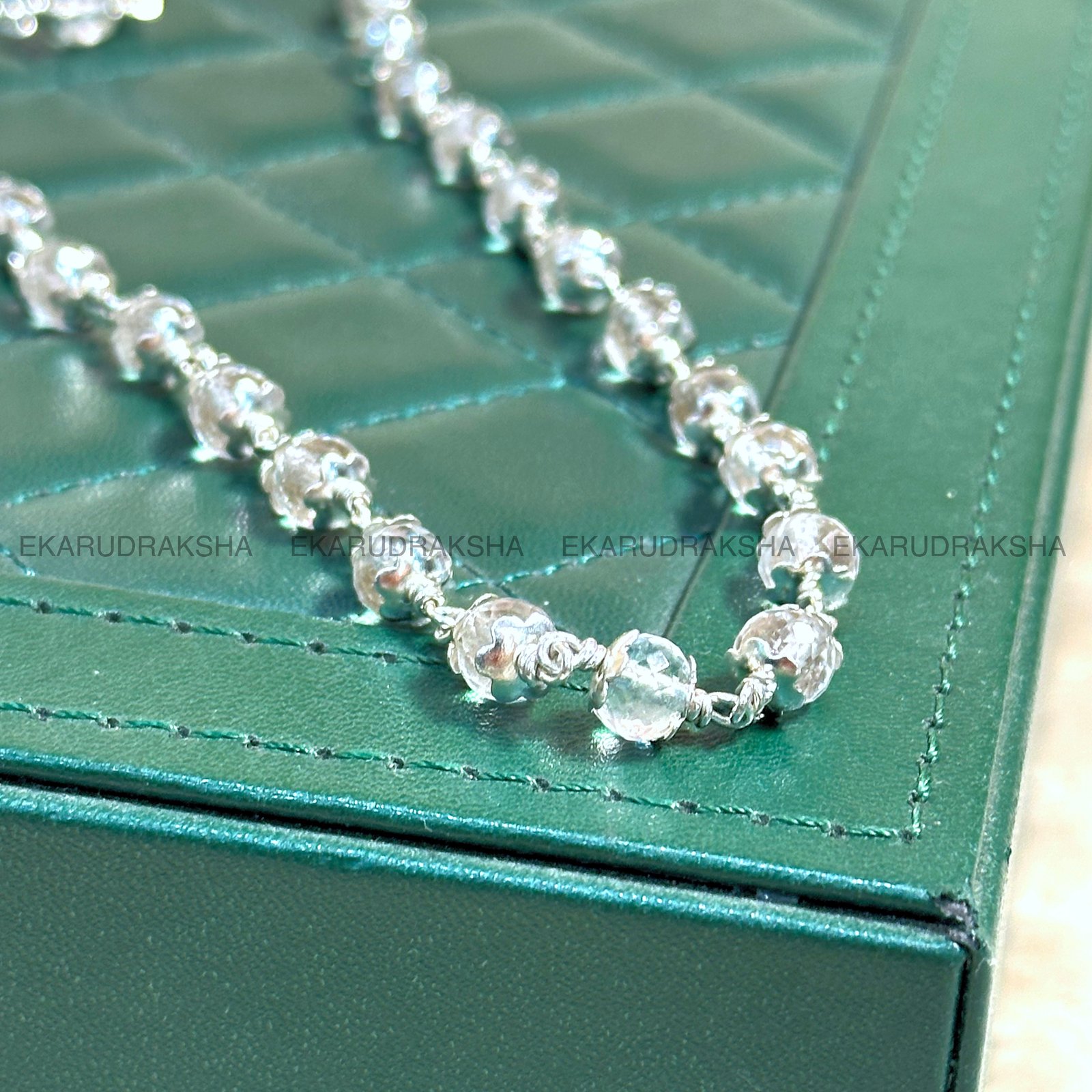 This mala is strung on a pure silver chain, which not only ensures durability but also amplifies the crystal’s natural healing properties. Silver is traditionally believed to have cooling and purifying effects, complementing the Sphatika’s benefits perfectly.