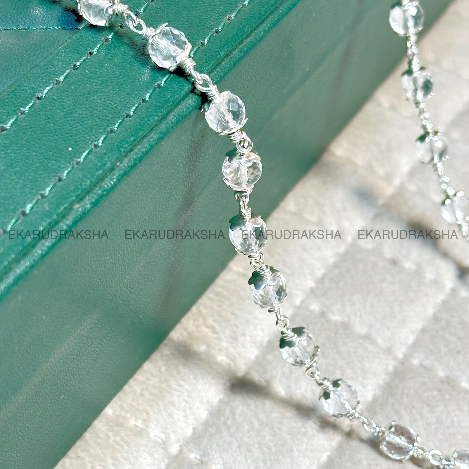 Crafted from Premium 7 mm diamond-cut Sphatika (pure Indian quartz crystal) beads, this 54-bead mala is hand-strung with a pure silver chain for strength and elegance.