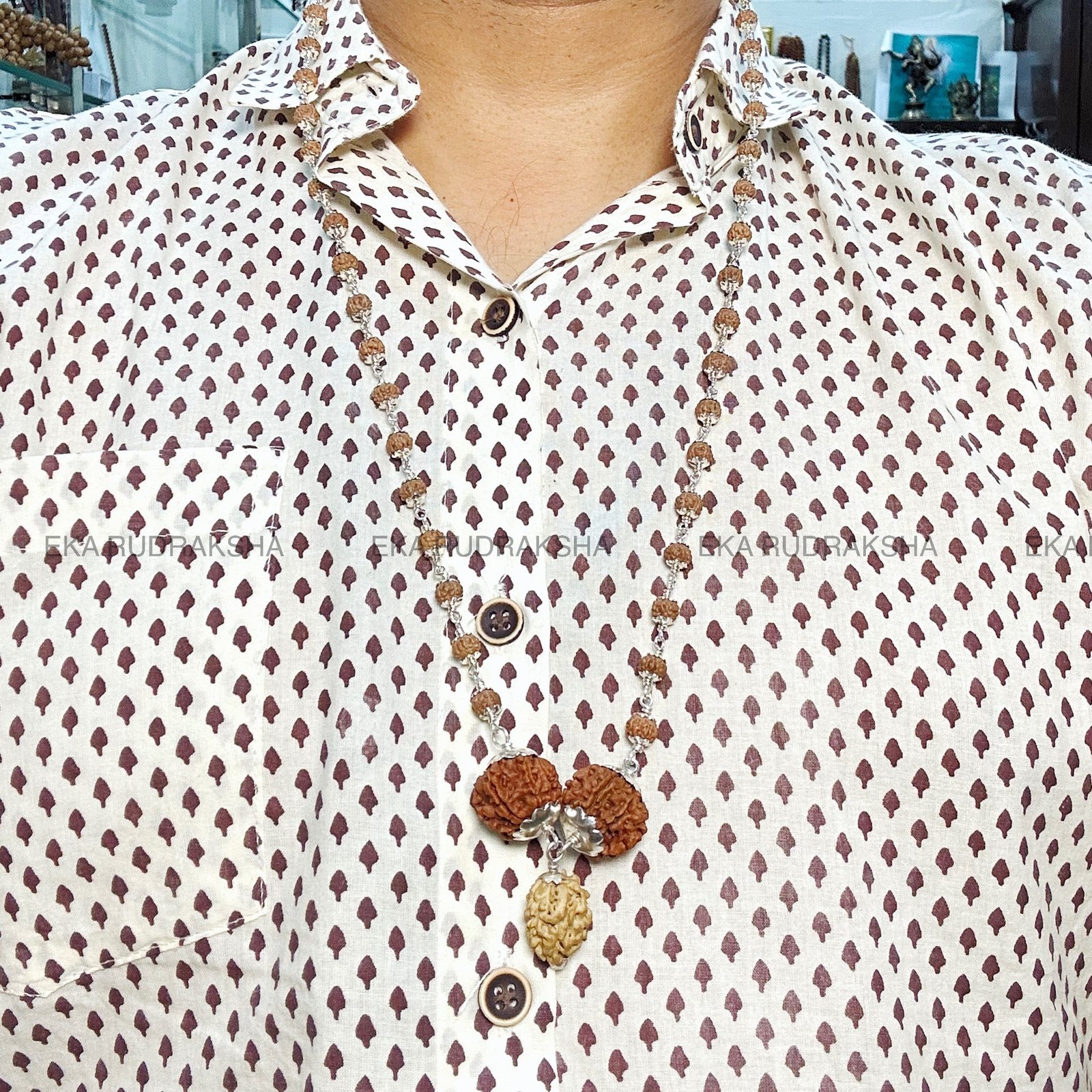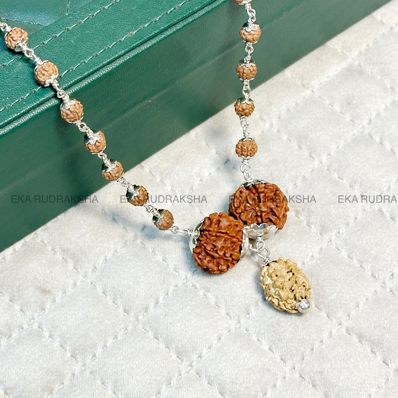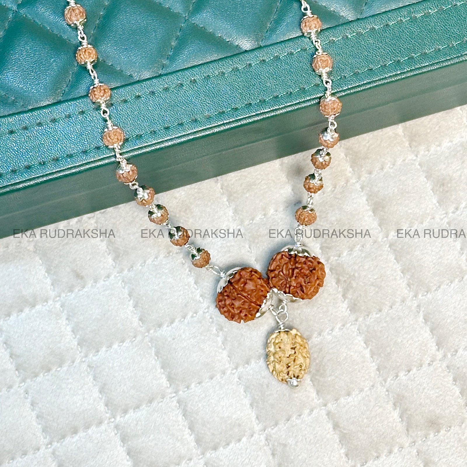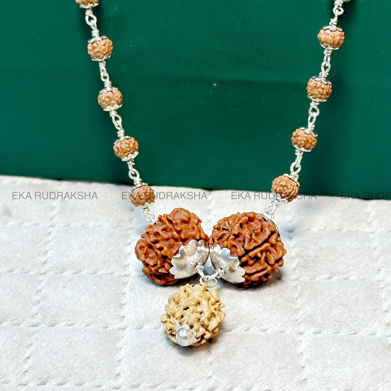 The Unity, Prosperity & Clarity Rudraksha Mala is a unique and powerful spiritual necklace designed for harmony, wealth, and obstacle removal. Crafted with authentic Nepali Rudraksha beads of 2 Mukhi, 7 Mukhi, and 8 Mukhi, and complemented by 52 Indonesian 5 Mukhi beads, this mala is elegantly finished in pure 925 silver capping for durability and spiritual vibration.