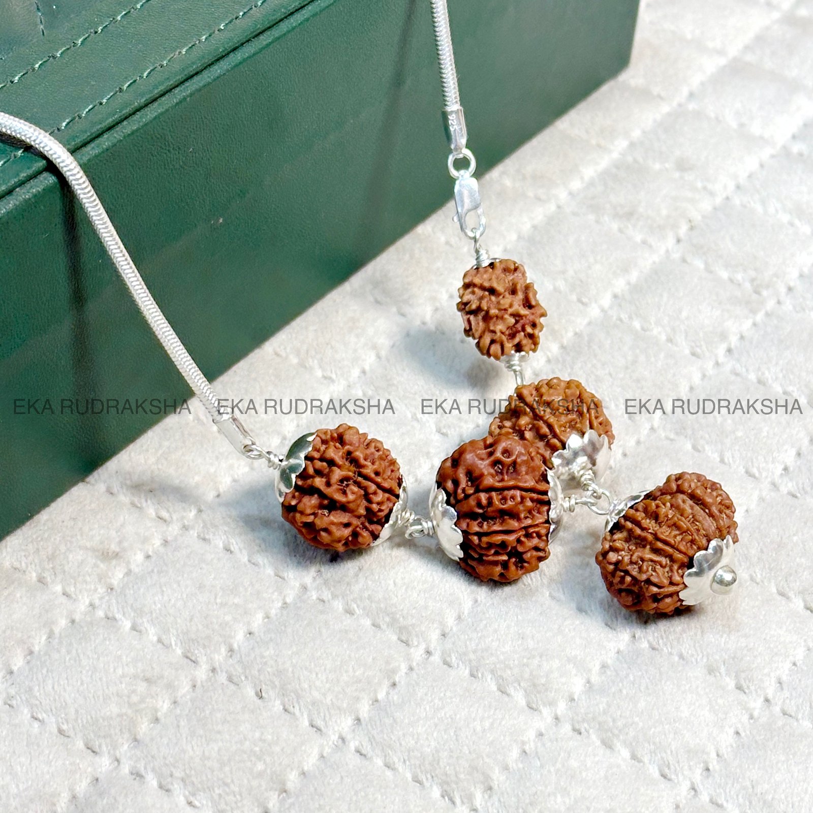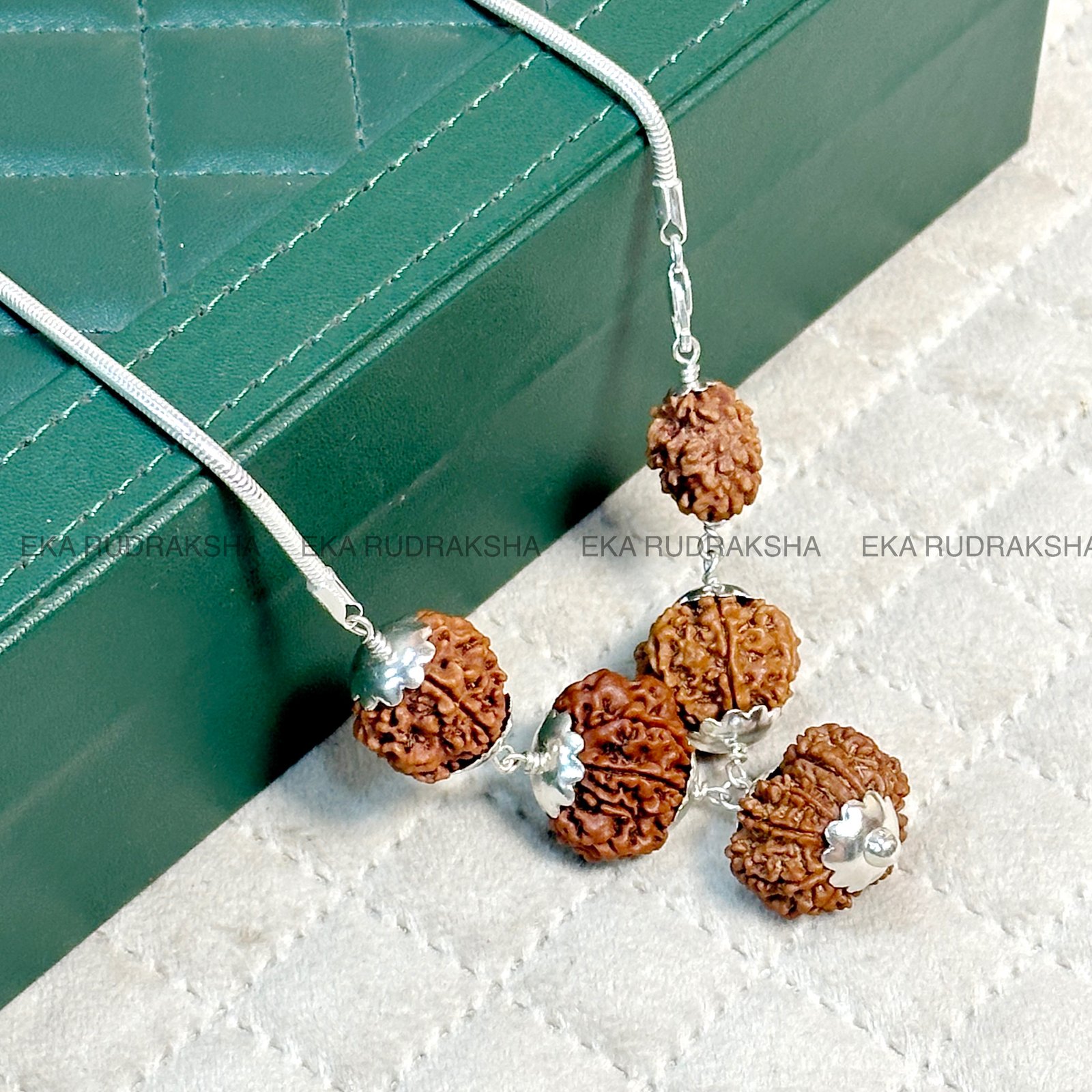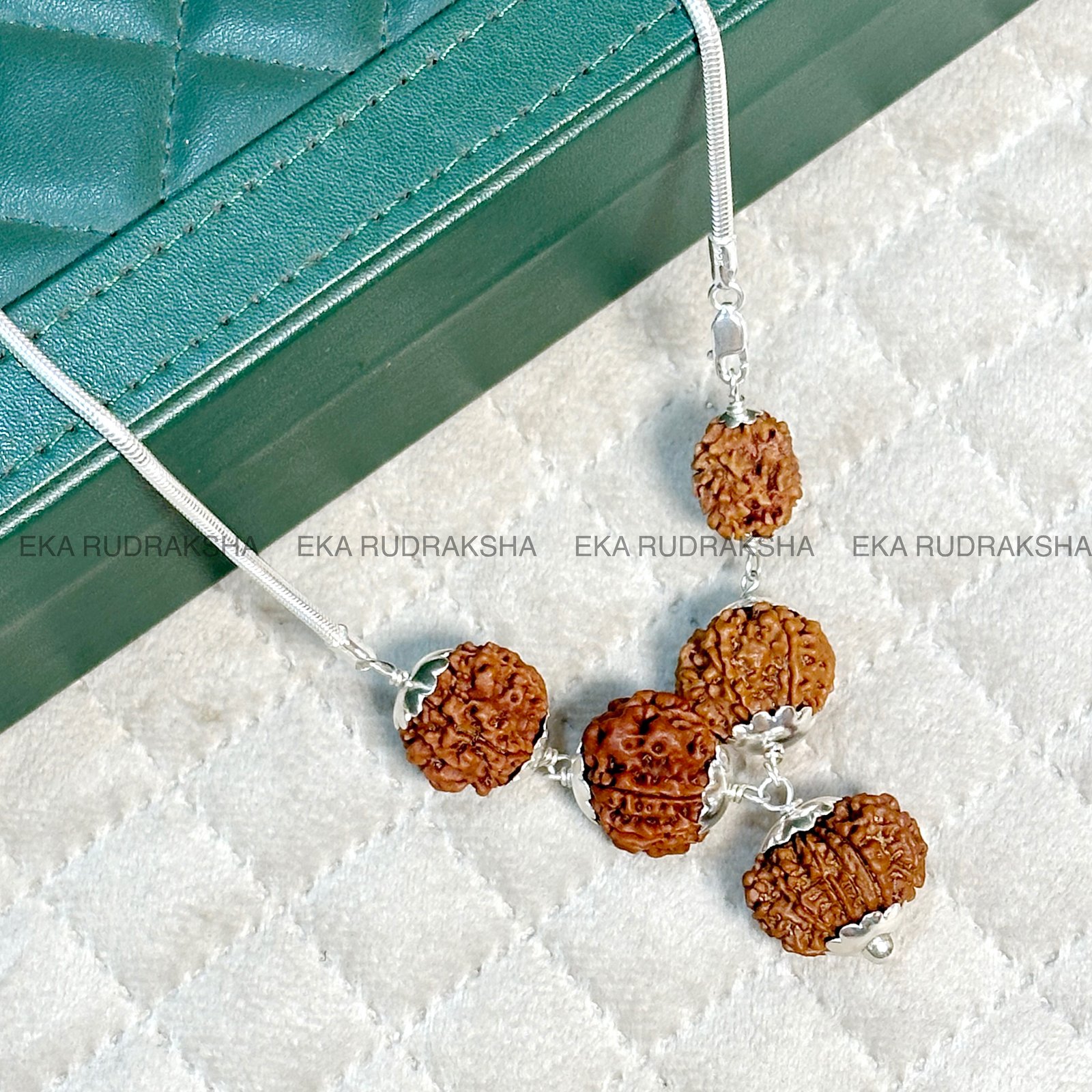 Together, these five Rudraksha beads form a balanced spiritual powerhouse—helping the wearer in personal, professional, financial, and health aspects of life. The silver capping not only enhances durability but also amplifies the spiritual vibrations, while the silver chain makes it elegant for daily wear.