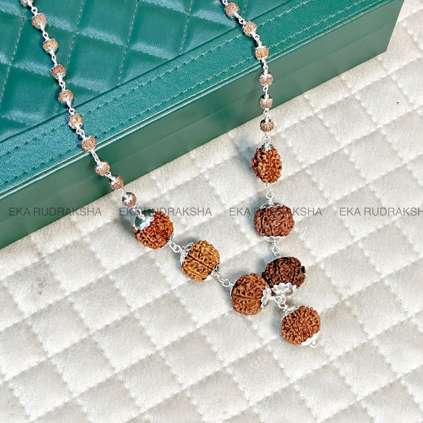 Together, this combination creates a holistic energy field—balancing relationships, boosting intellect, bringing wealth and prosperity, protecting from negativity, and instilling courage and vitality. The silver capping not only ensures durability but also amplifies the divine energy of each bead, while the 925 silver Panchmukhi beads provide stability and grounding for everyday wear.