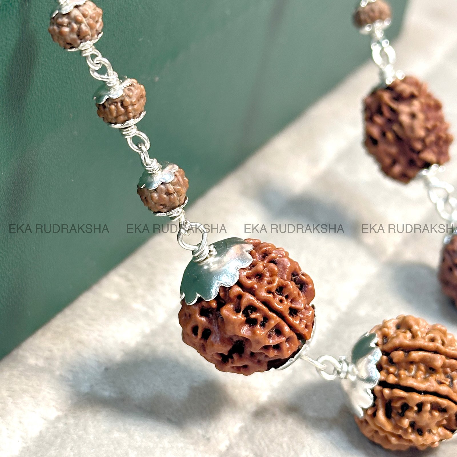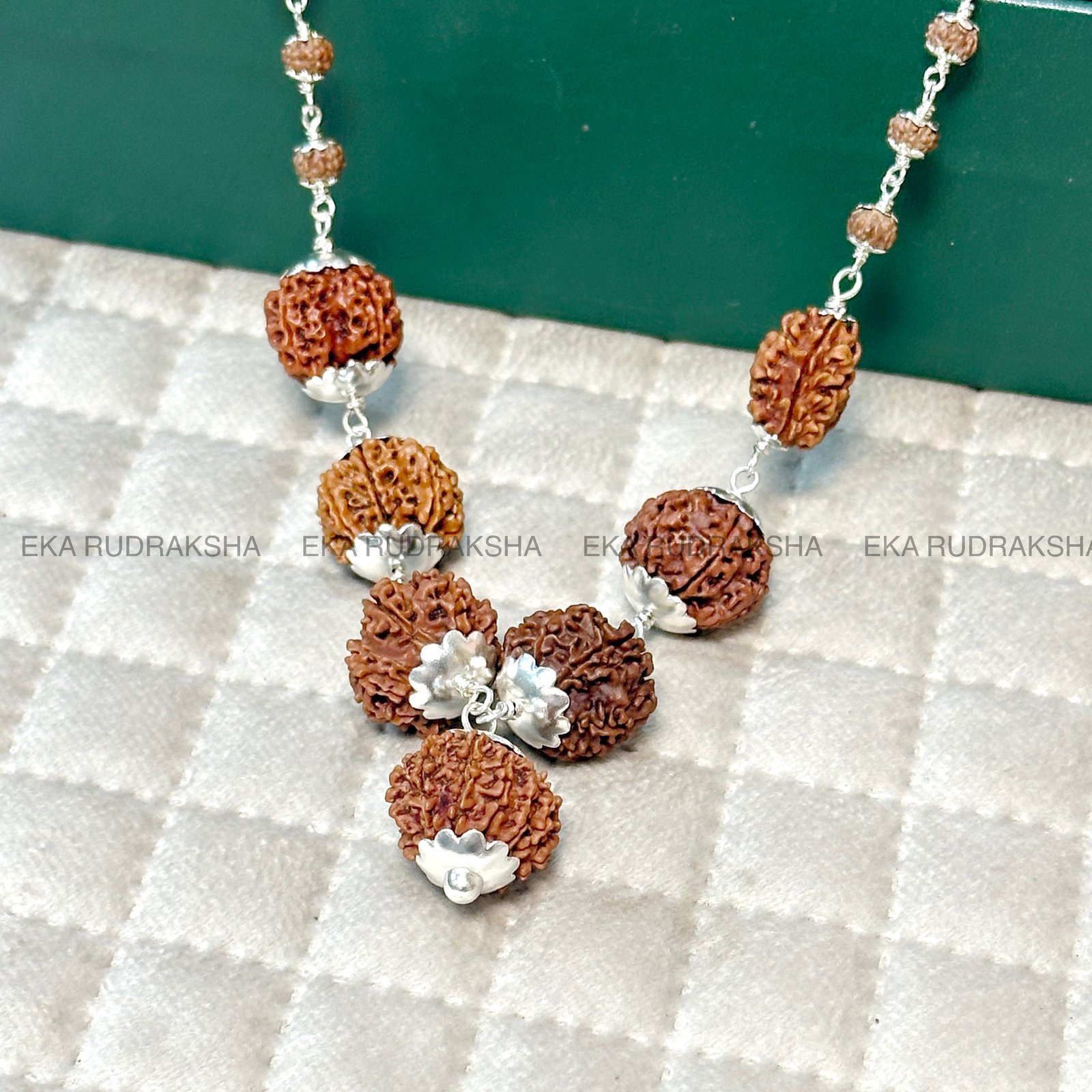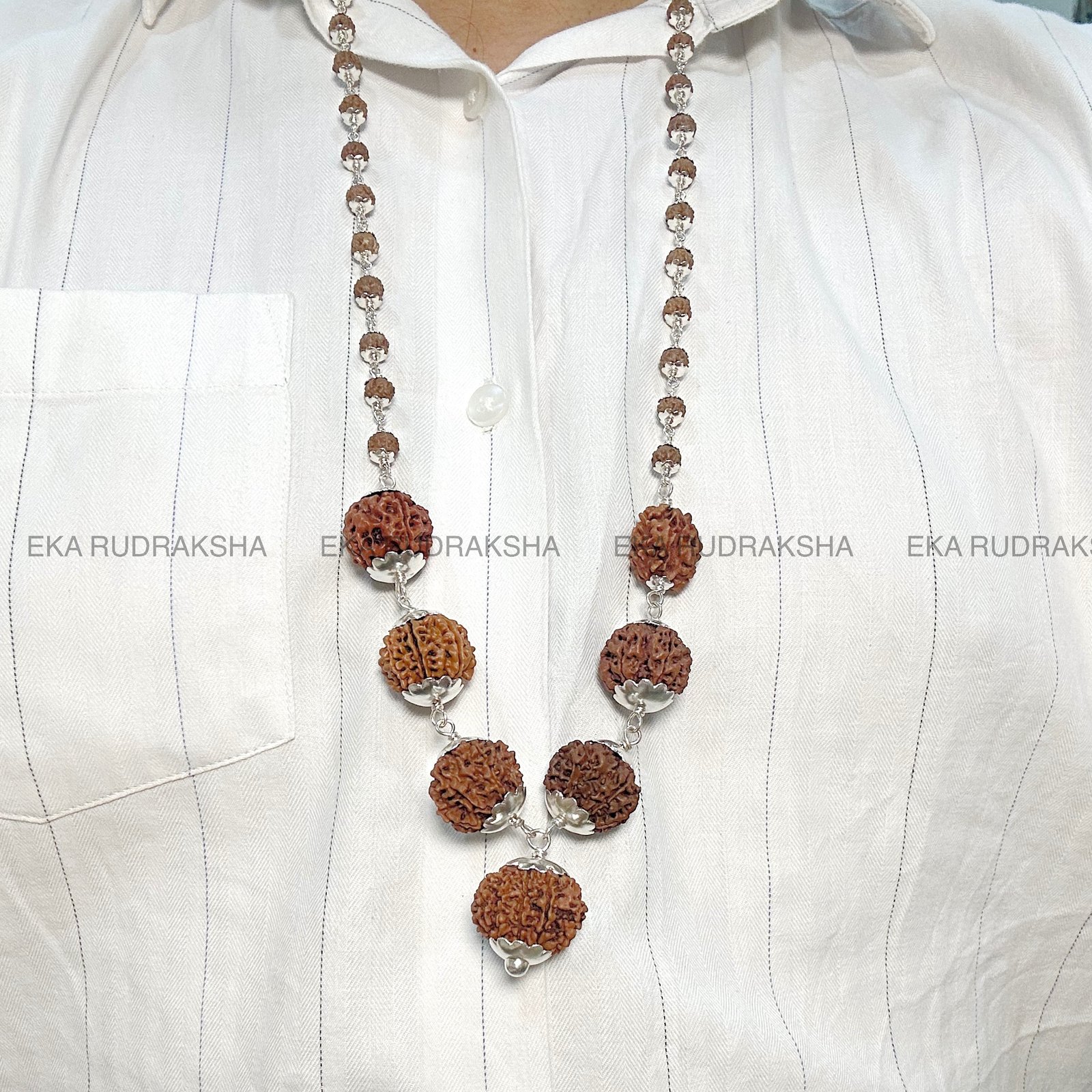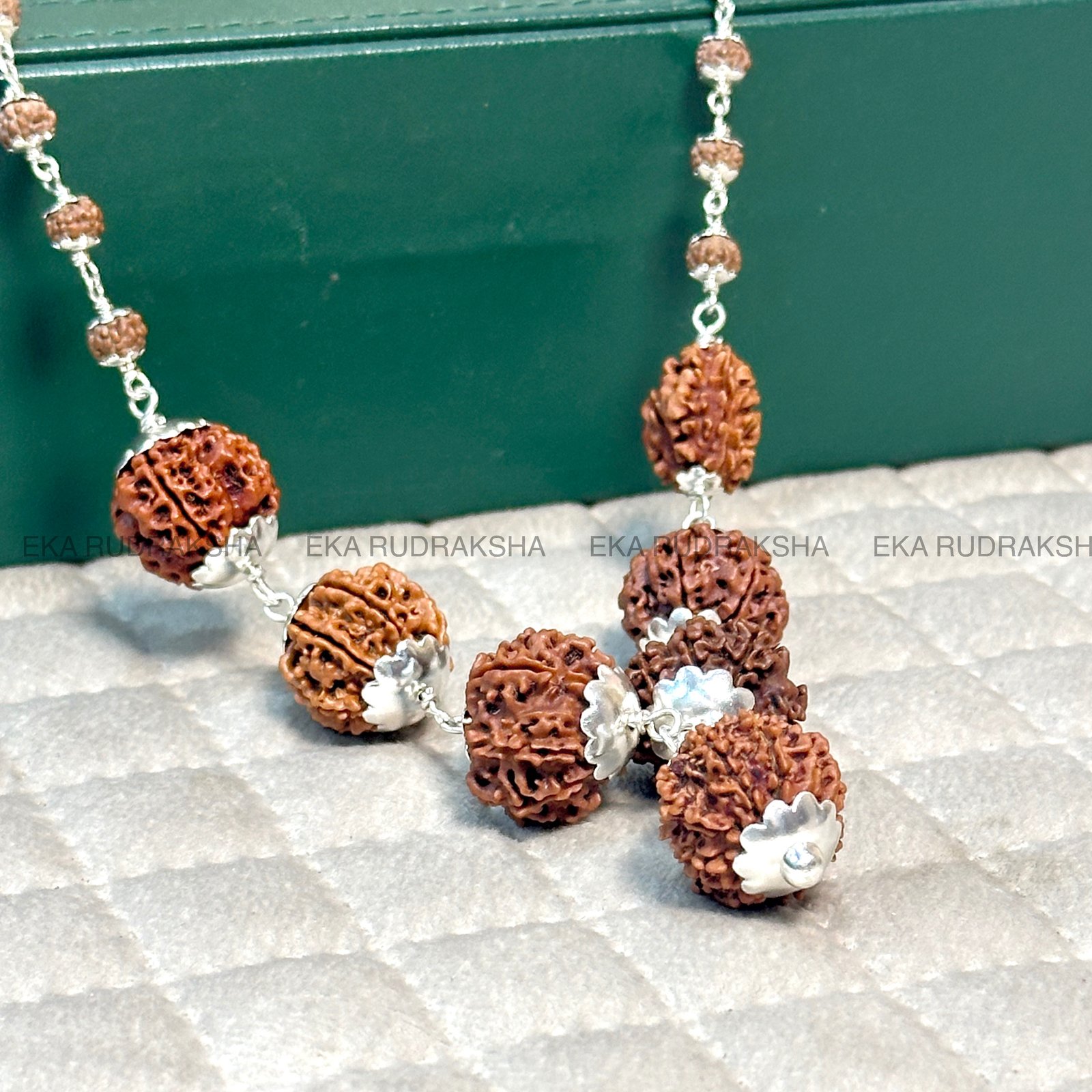The Wealth, Wisdom & Strength Rudraksha Mala is a unique and powerful spiritual necklace designed to bring harmony, prosperity, knowledge, and protection to the wearer. This sacred mala is crafted with authentic Nepali Rudraksha beads of 2, 4, 6, 7, 8, 9, and 11 Mukhi, each carrying divine blessings, and complemented by 925 silver-capped Panchmukhi Rudraksha beads for balance and peace.