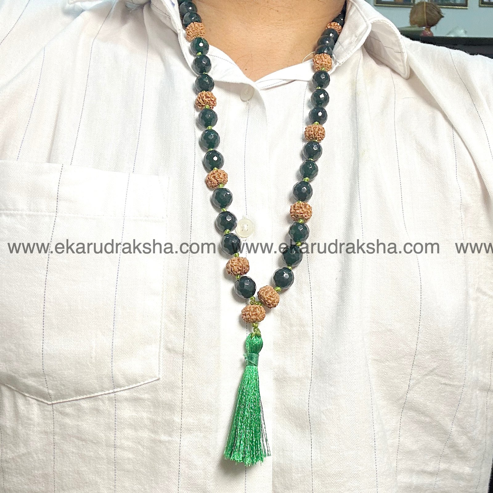 The divine necklace is carefully prepared using Original 6 Mukhi Rudraksha and pure diamond cut Green jade beads to complete the auspicious number of 108. The 6 Mukhi rudraksha is blessed by Lord Murugan Bala Subramanian who provides us good luck in our life. The green jade bring peace and prosperity in life. This mala can be worn daily by both Men and Women.