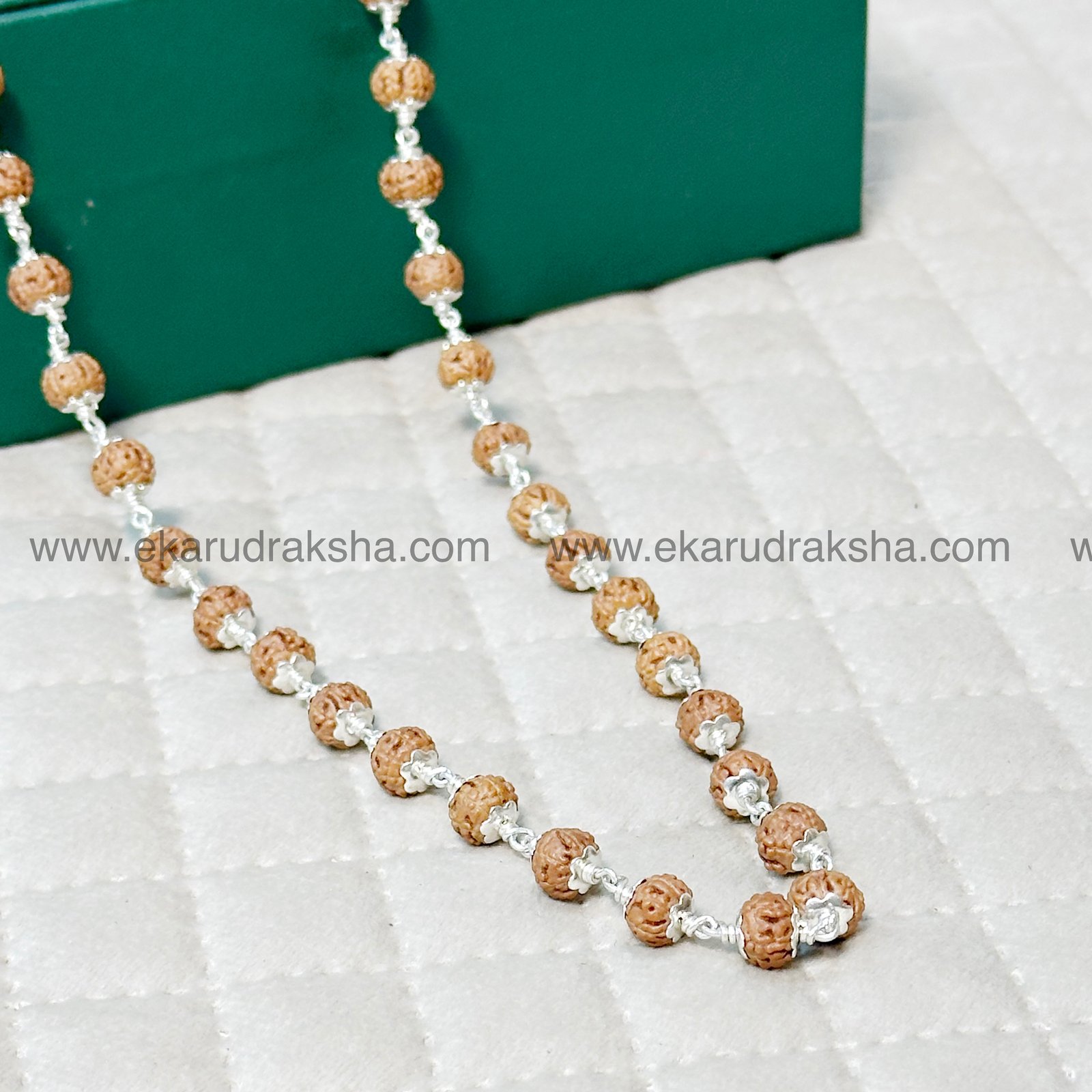 This beautiful Silver necklace chain is made using 100% original 7 mukhi rudraksha. This mala is perfect for those looking for benefits of 7 mukhi such as financial growth, saturn sade sati relief plus want to make a style statement.