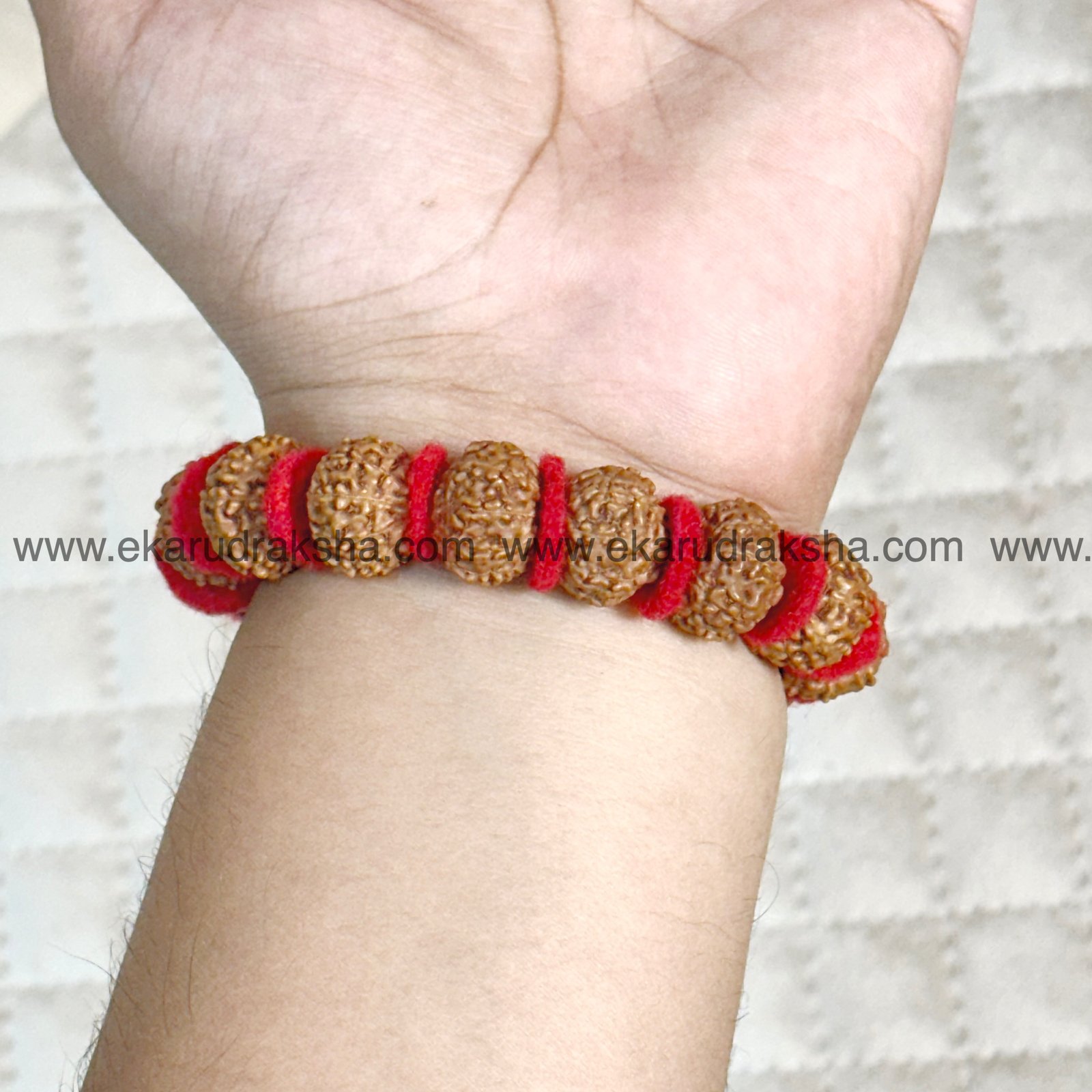 The 9 Mukhi rudraksha bracelet is a superb bracelet to receive the divine blessings of Maa Durga Shakti - The feminine form of God. This rudraksha bracelet is made from 100% Original 9 mukhi rudraksha beads with red woolen spacers. The 9 mukhi bracelet is done in adjustable elastic string for durability. It can be used by both men and women to get protection from negativity and confidence to build courage & inner power.