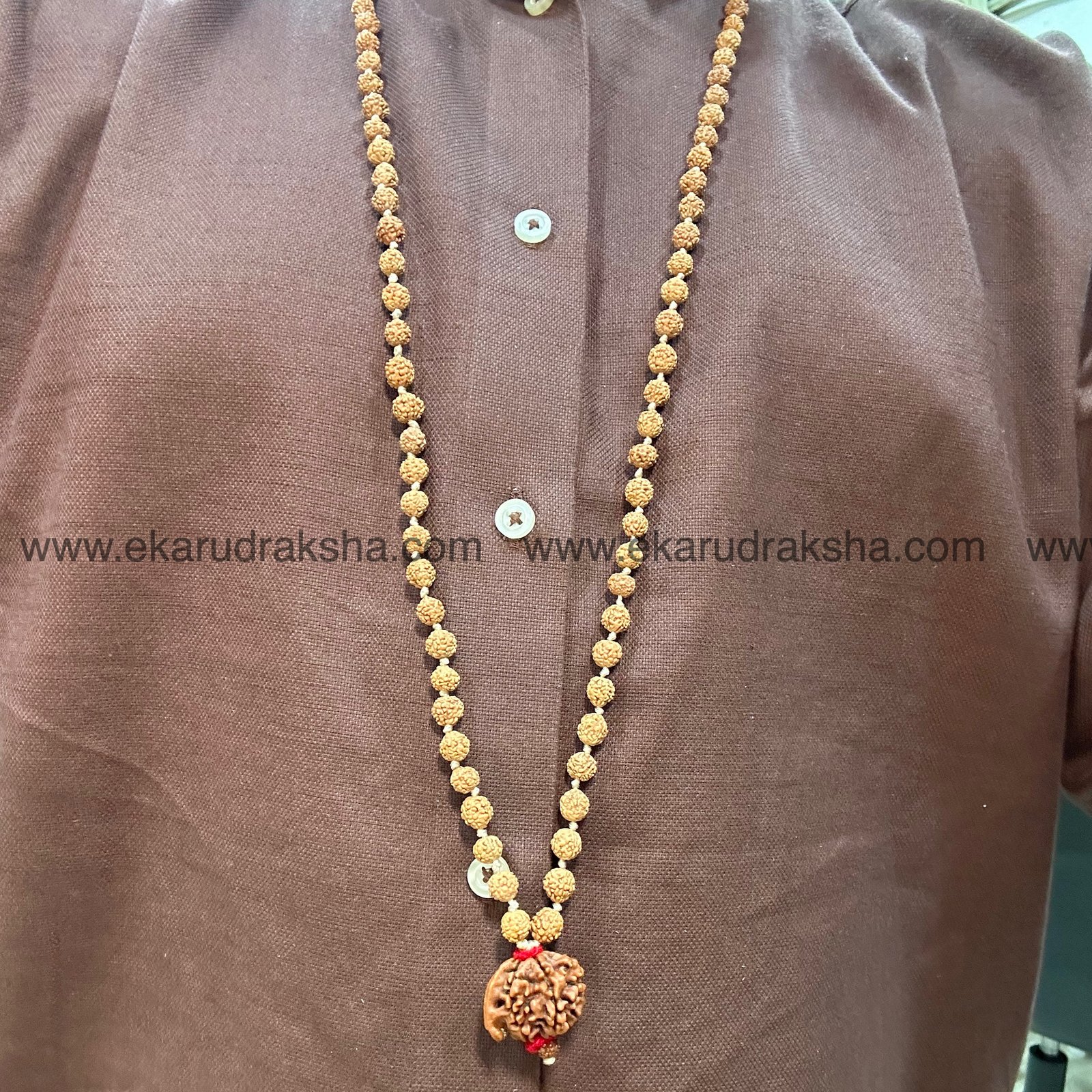 The Ganesha Rudraksha mala is made using 100% Pure Nepali Ganesha Rudraksha as a Shikha. The Mala has a total of 108 no. of 5 mukhi small rudrakshas and one bead of Ganesha Rudraksha. The mala is perfect for those who want the blessings of Lord Ganesha who will bring Good luck and remove all obstacles in the wearer's life.
