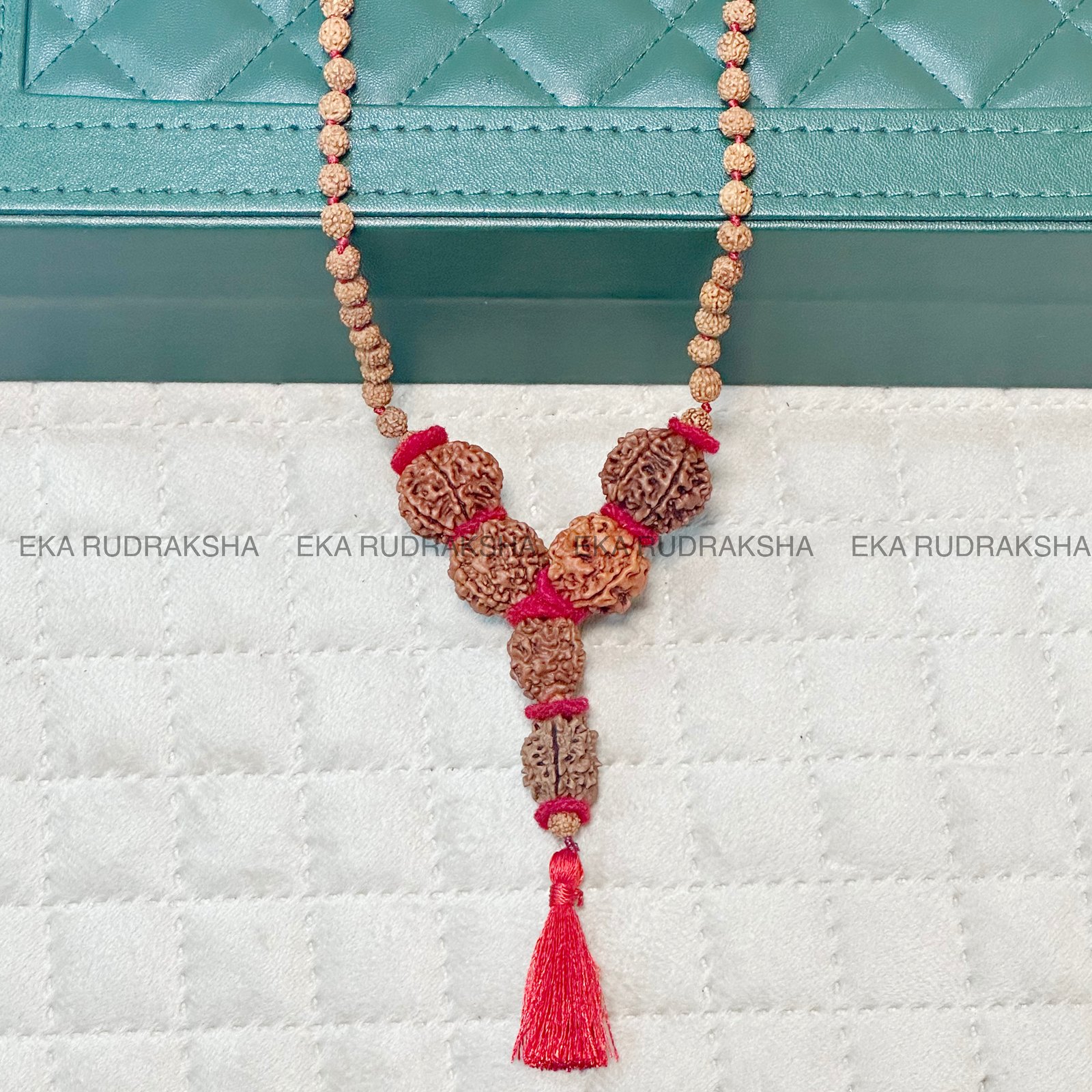 Comprising lab-certified 2, 3, 4, 5, 6, and 7 mukhi Rudraksha beads, this necklace works holistically to promote immunity, boost energy, and attract success in all endeavors. Each bead serves a specific purpose, helping to harmonize the mind and body, reduce anxiety, and increase mental clarity.
