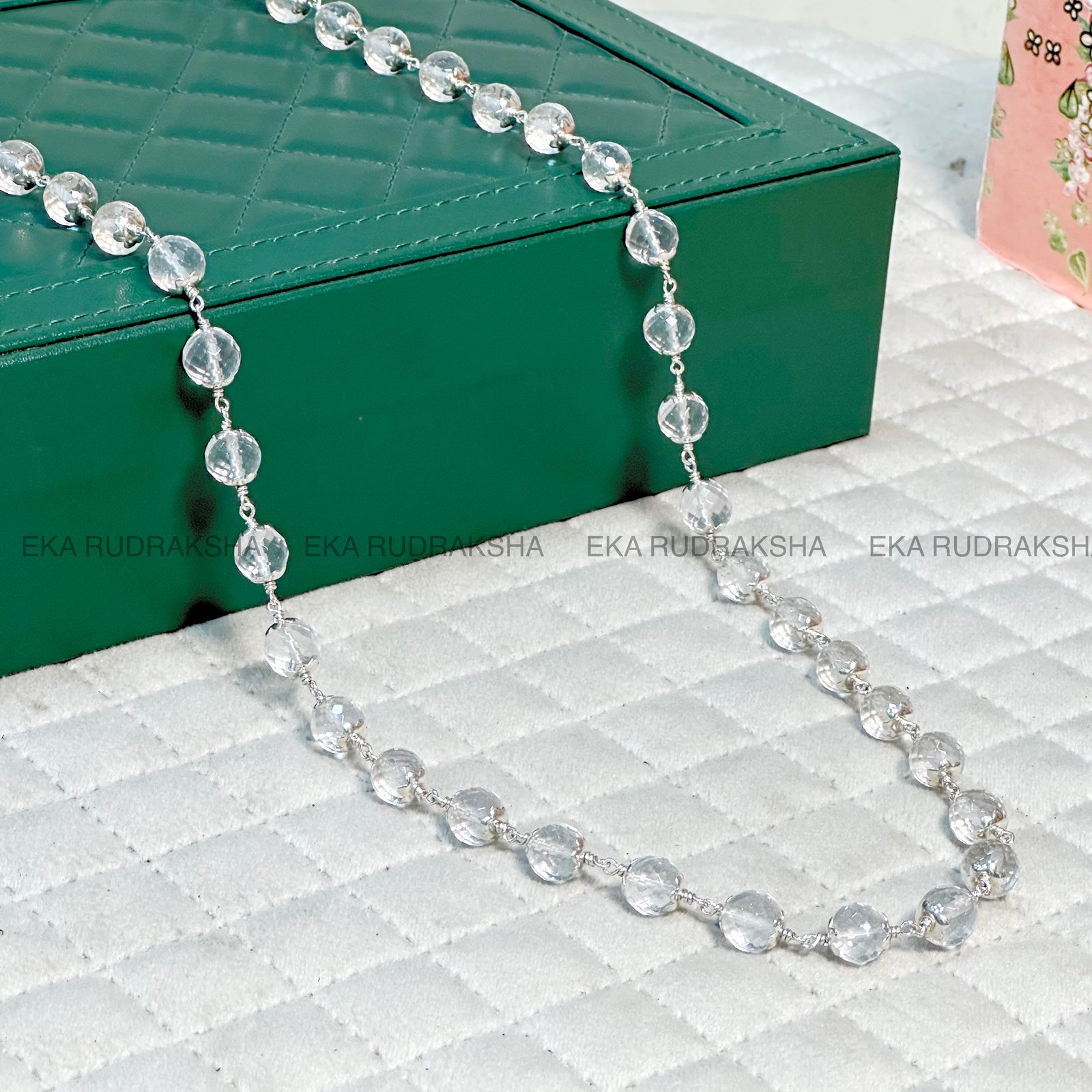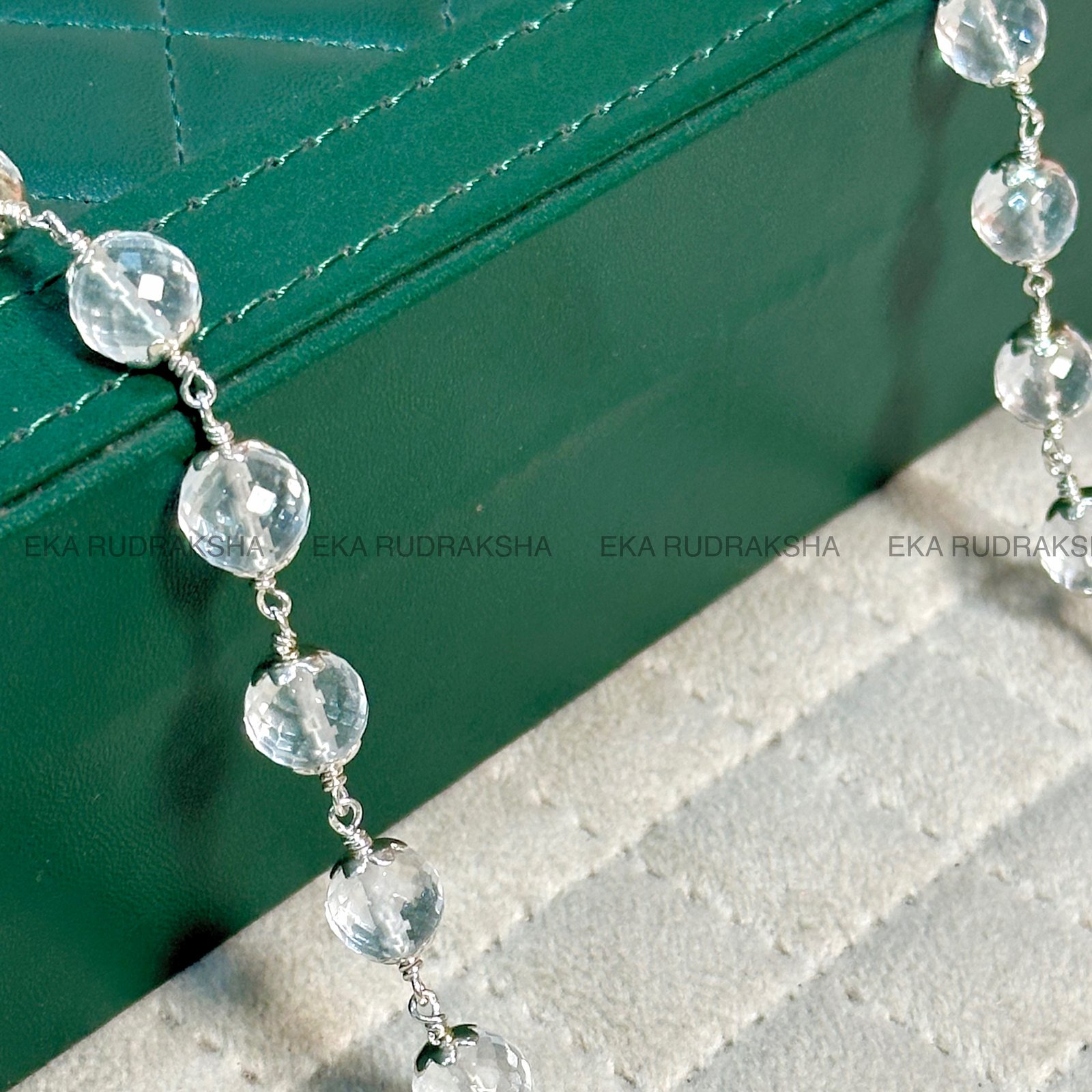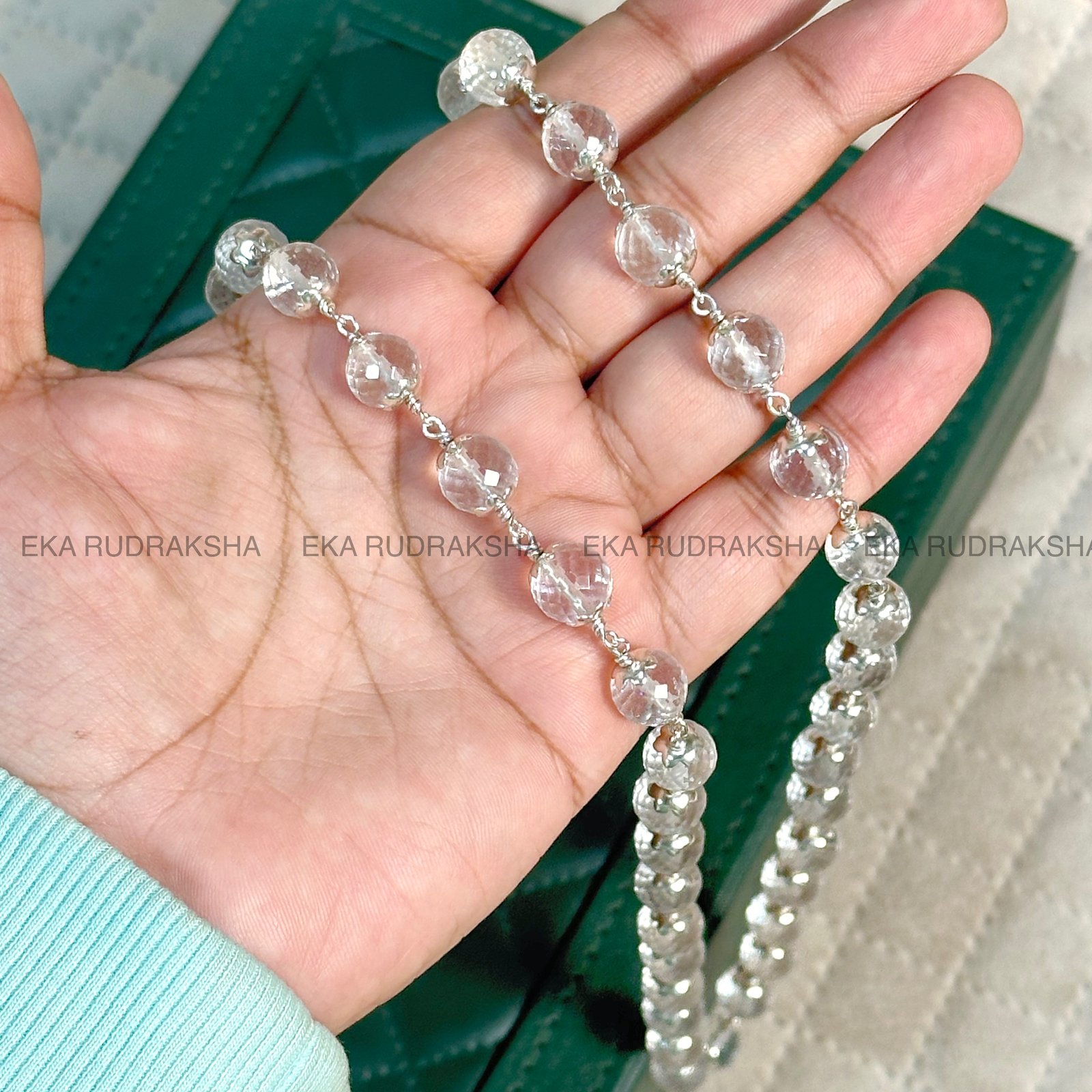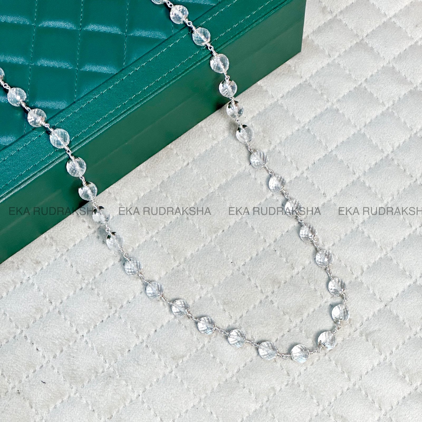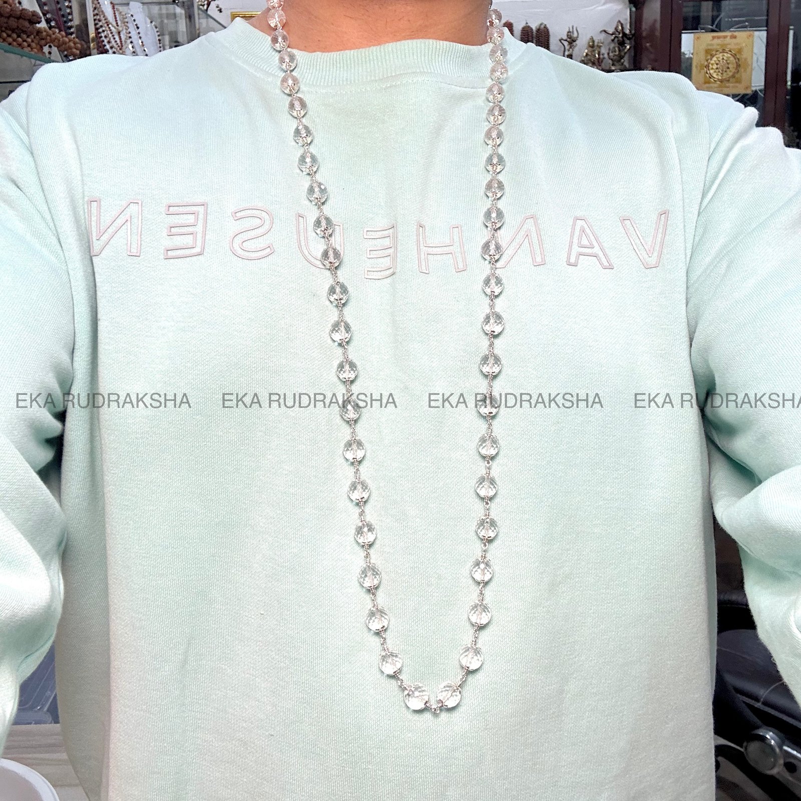 Now elevate your mind with the calming sphatik 10 mm diamond cut necklace mala. This mala is done with 54 beads of diamond cut sphatika in pure silver wire and designer silver caps. For customization Contact us